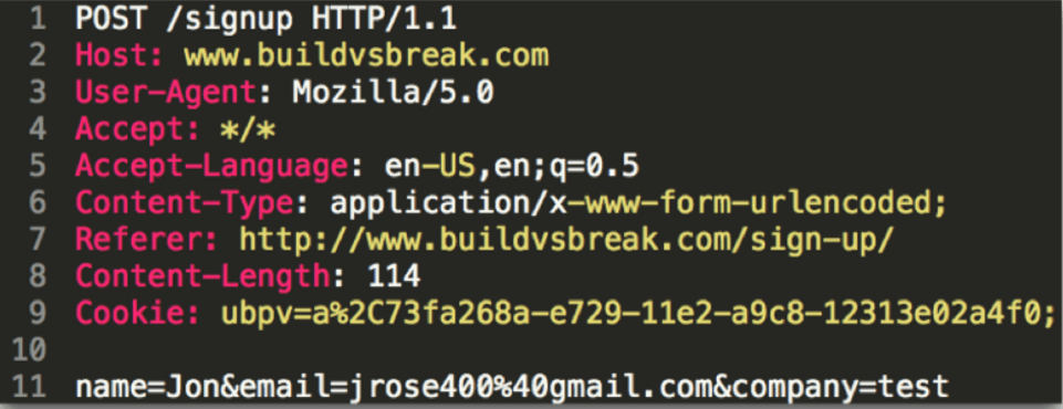 There are a few things worth noting in the screenshot above. Let’s take a look at the first line. First, the HTTP “verb” is GET, which is generally used to retrieve a document, image, or other internet resource. We will look at the other verbs in a minute. Next, the webpage being requested is “/home”. Anything after the “?” are parameters, which come in key/value pairs. Finally, the HTTP version is provided, which in this case is 1.1.